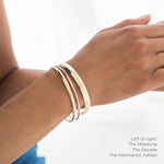 The Decade is a fabulous bangle. I contacted Yearly before I made my first purchase for a recommendation as I wanted a bangle that didn’t bend. I wanted to wear them continuously and I can be unknowingly rough sometimes with my jewelry. The Decade is the right one for me. It is weighty, beautiful, and does not bend. I now have three and will definitely add to this stack.