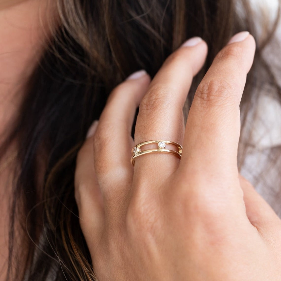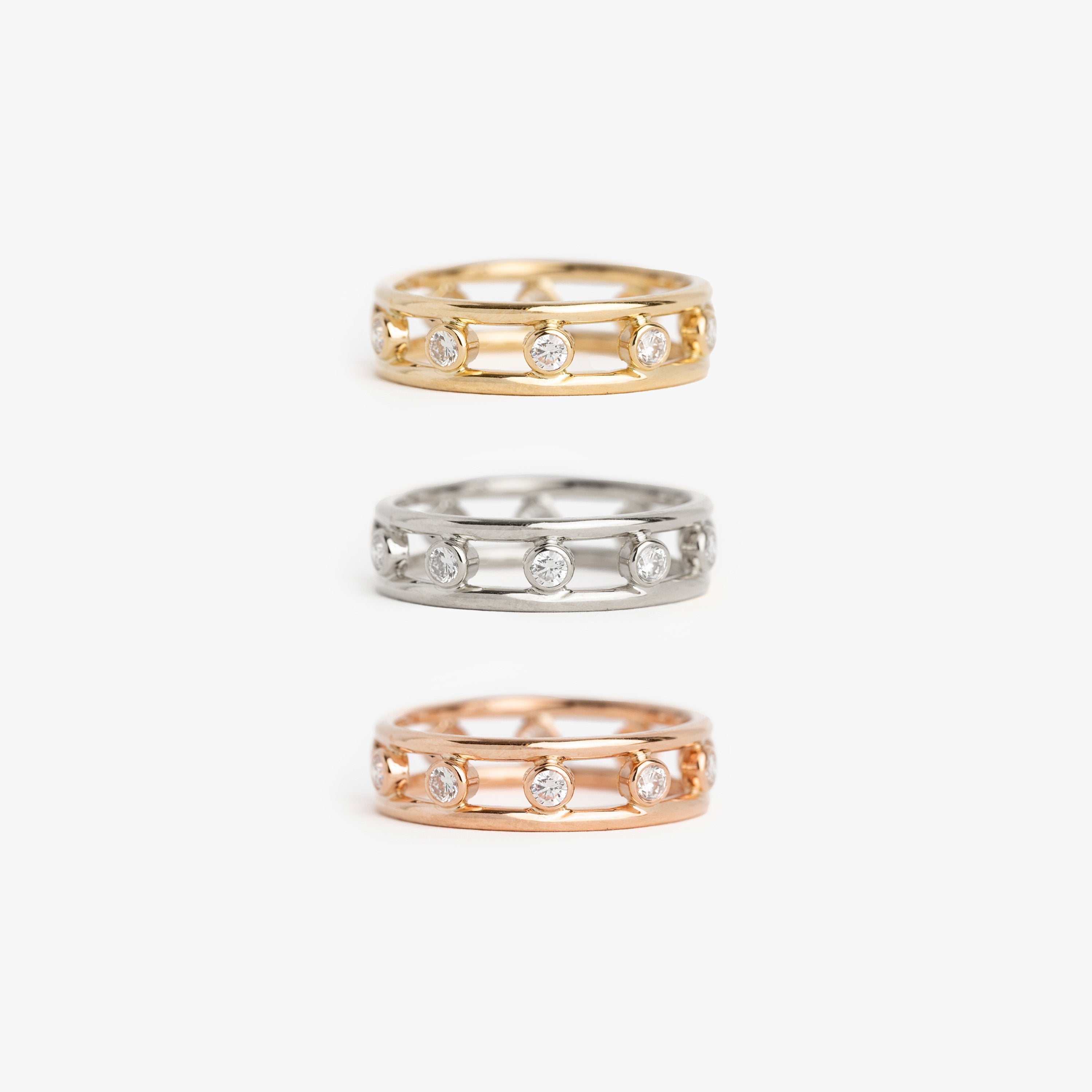 The Anniversary Band is made of two stacking rings joined by 6-10 bezel set diamonds, creating a stunning double decker statement band. Celebrate your biggest milestones with this custom design you can wear and enjoy every day.