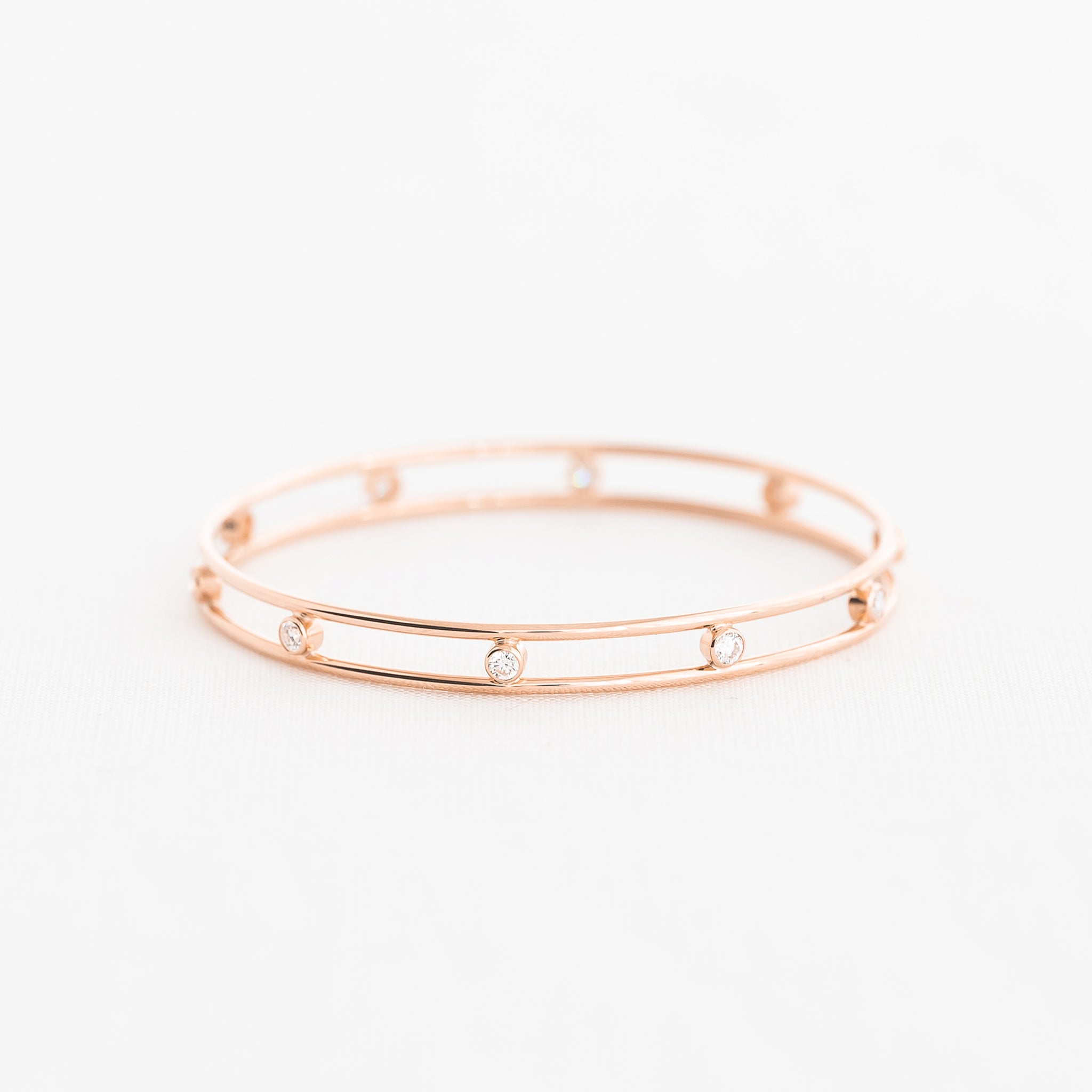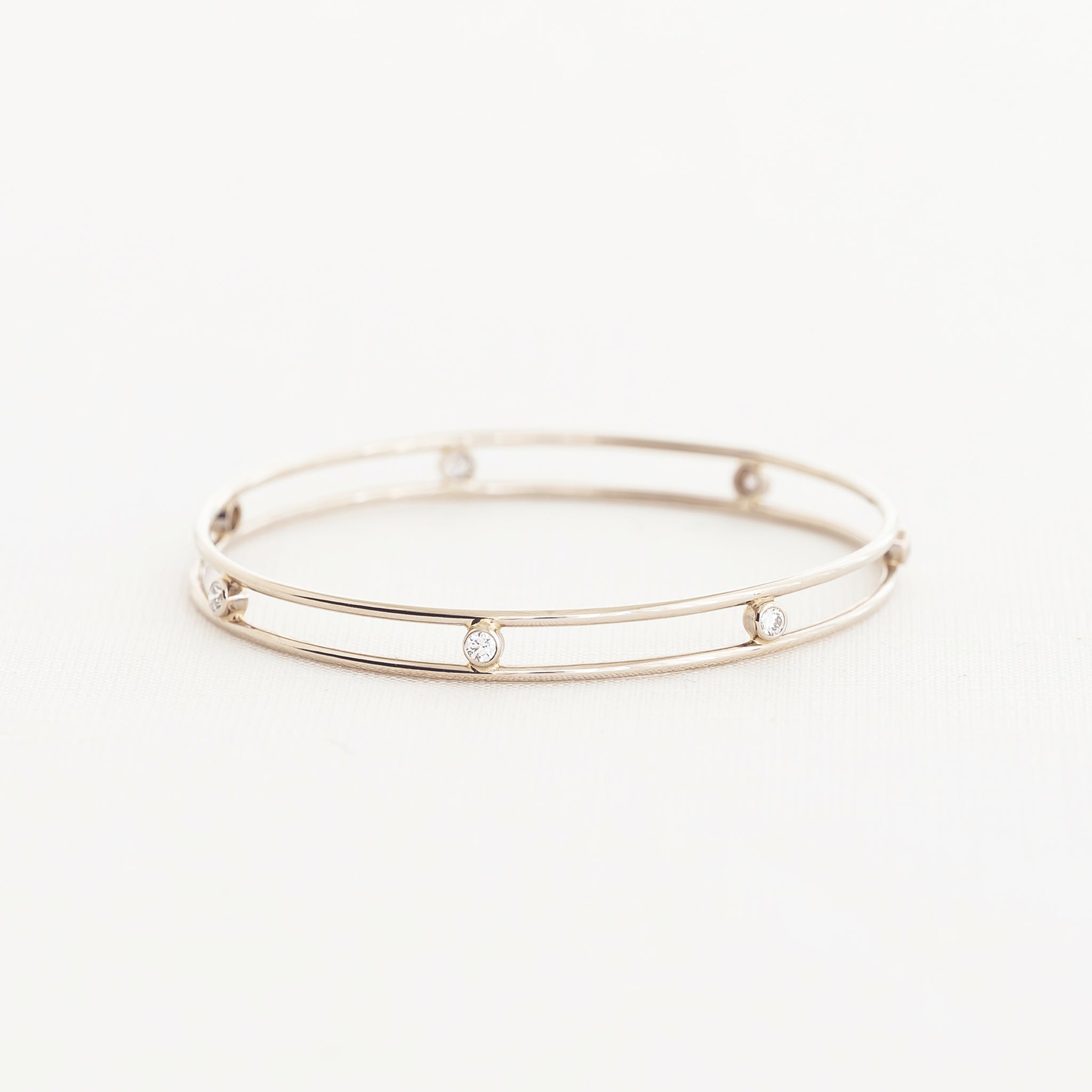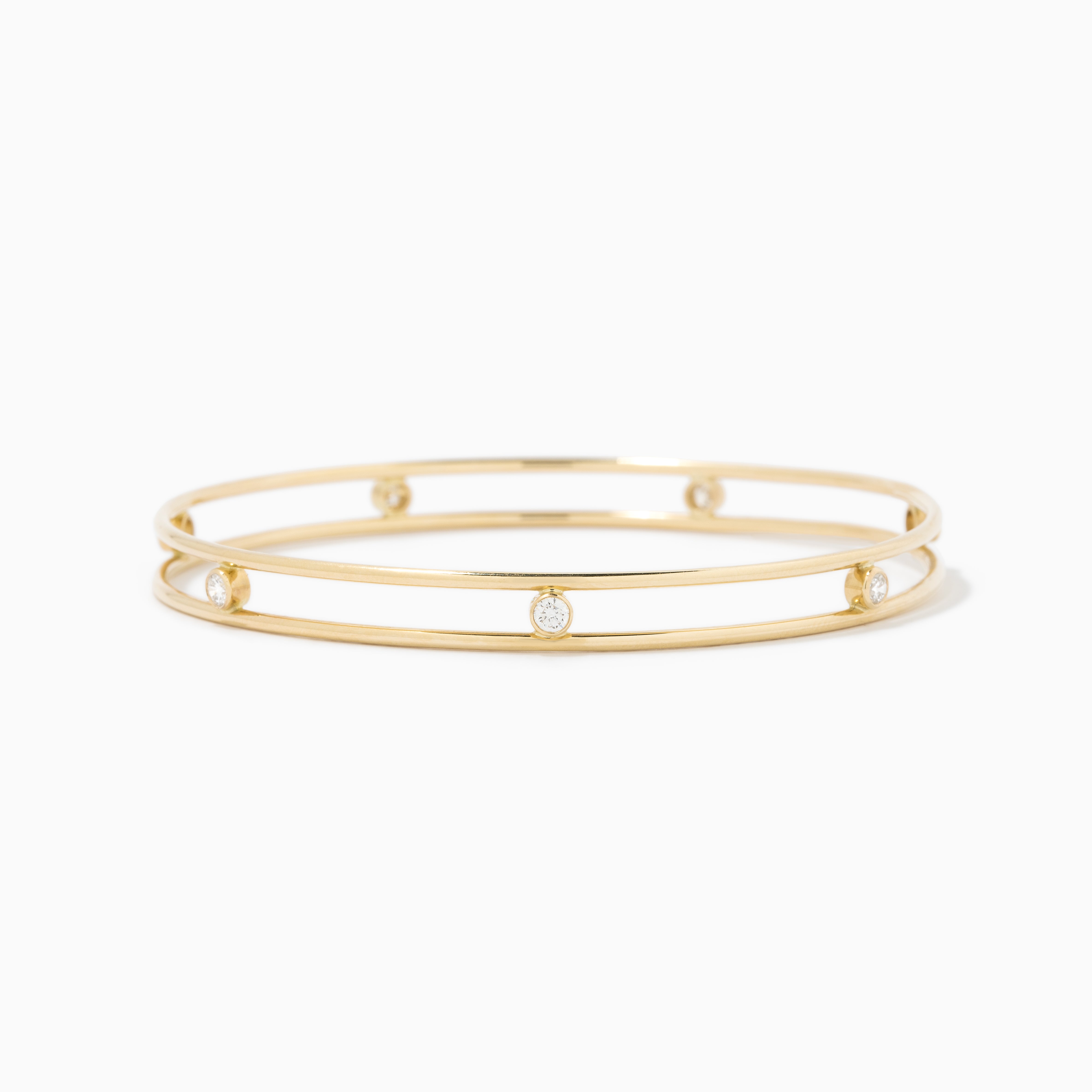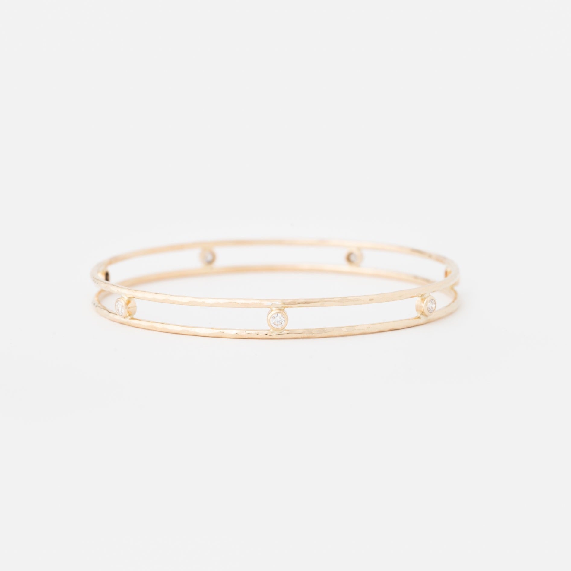 Two of our Heavy Weight stacking bangles are joined by seven to ten bezel set diamonds, creating a stunning double-decker statement piece. Two 1.6mm round, solid 14k gold bangles.