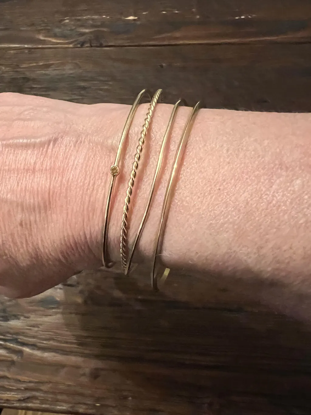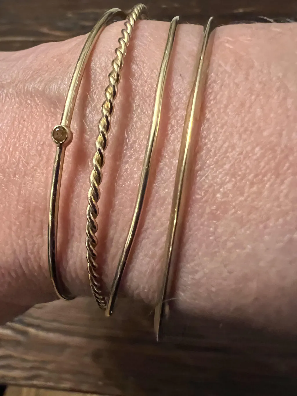 A 1.6mm at the widest point, solid 14k gold hand twisted bangle.