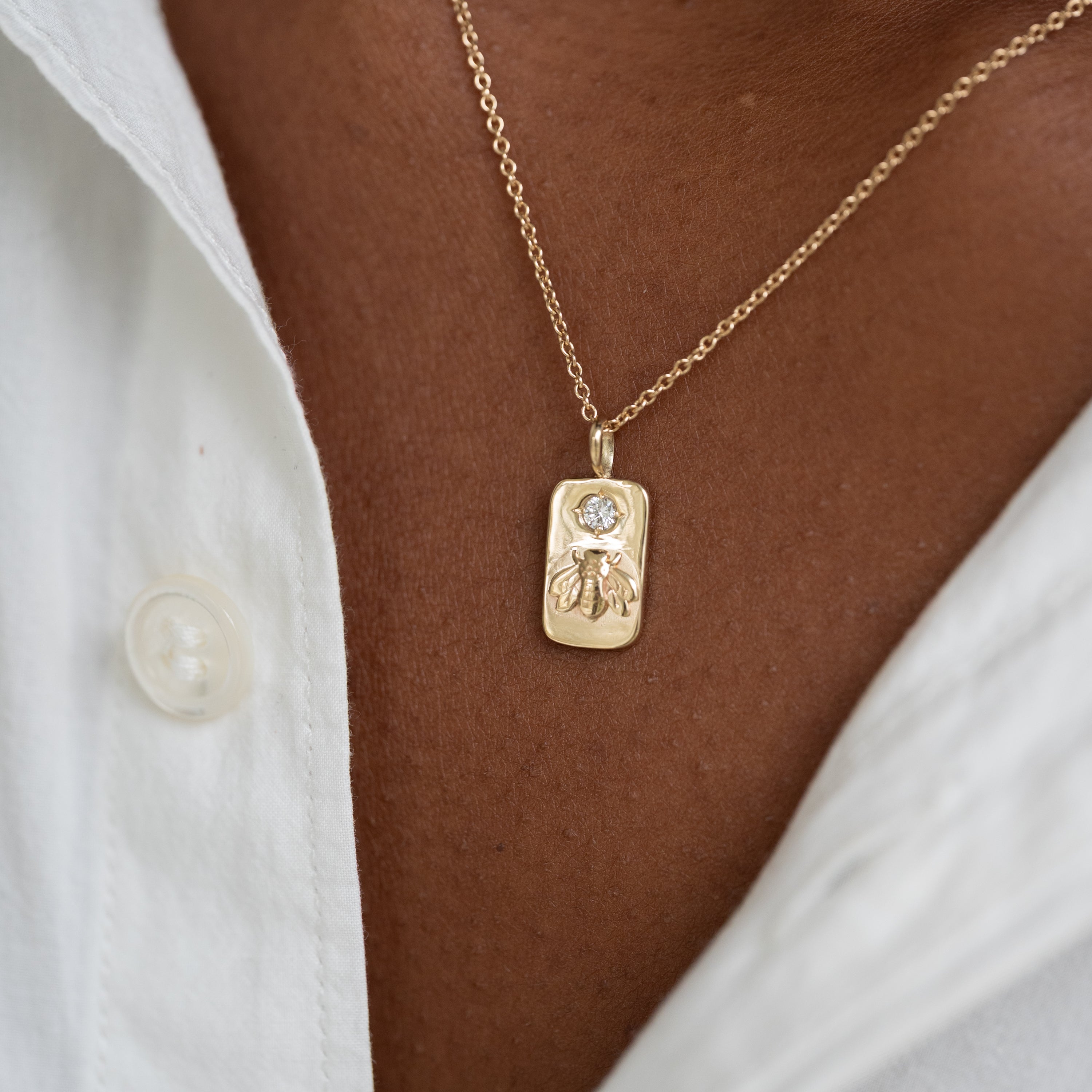 A 13 x 8 mm pendant featuring a bee and 0.03 ct diamond.