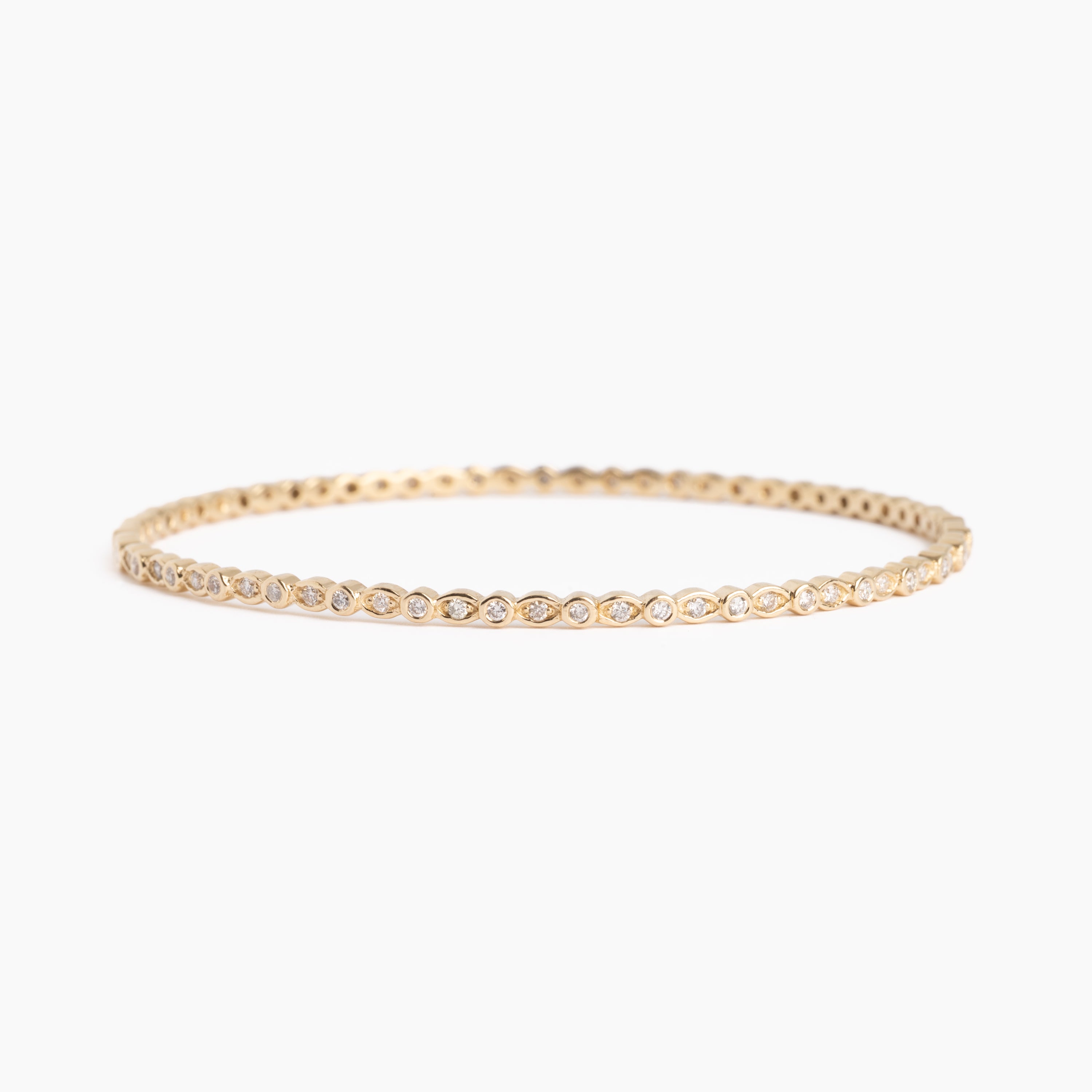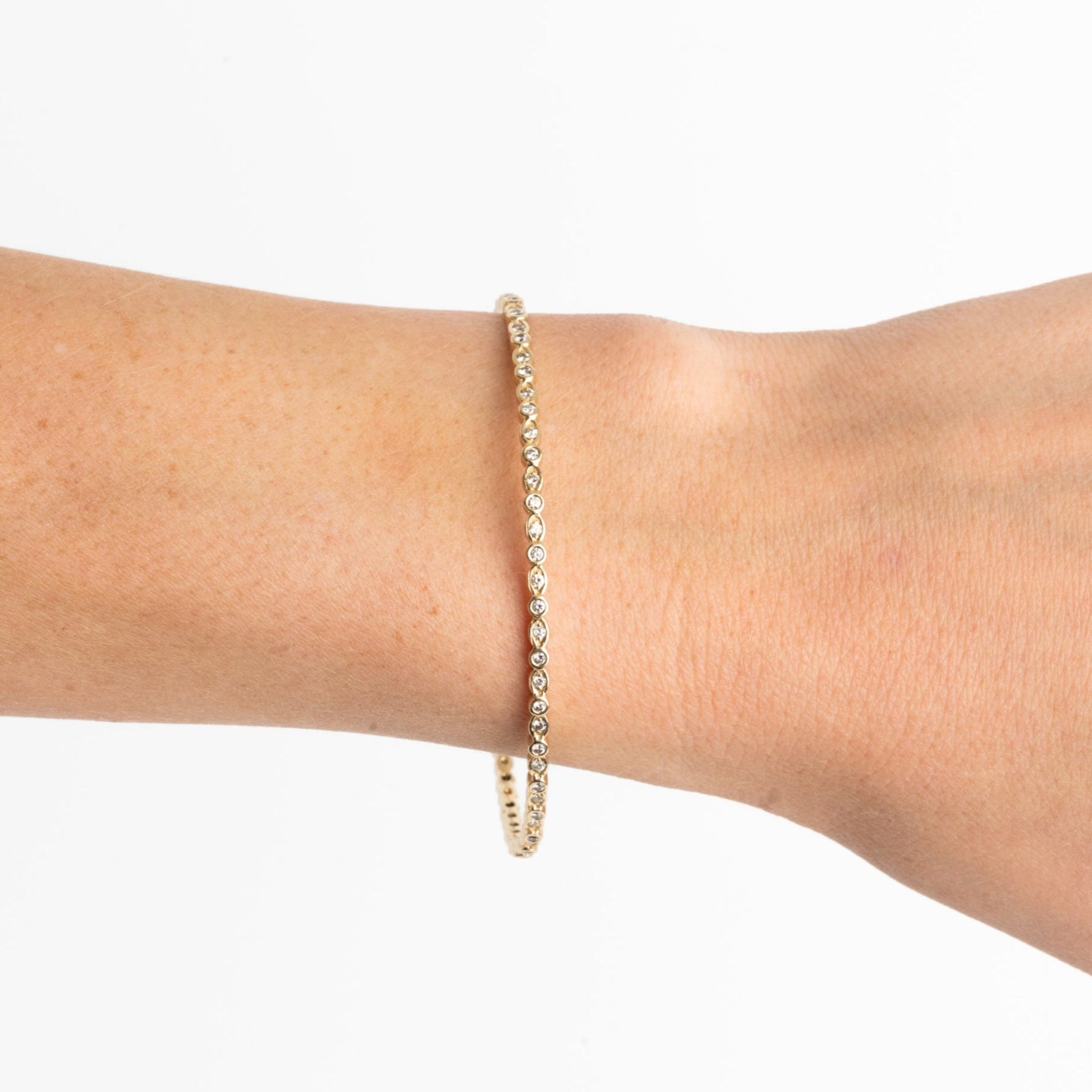 The Diamond Eternity Bangle features a continuous line of brilliant diamonds, handset in solid 14k gold to symbolize endless love and lasting strength. Designed for daily wear, each bangle is custom-sized for a perfect fit—an heirloom to celebrate your story, year after year.