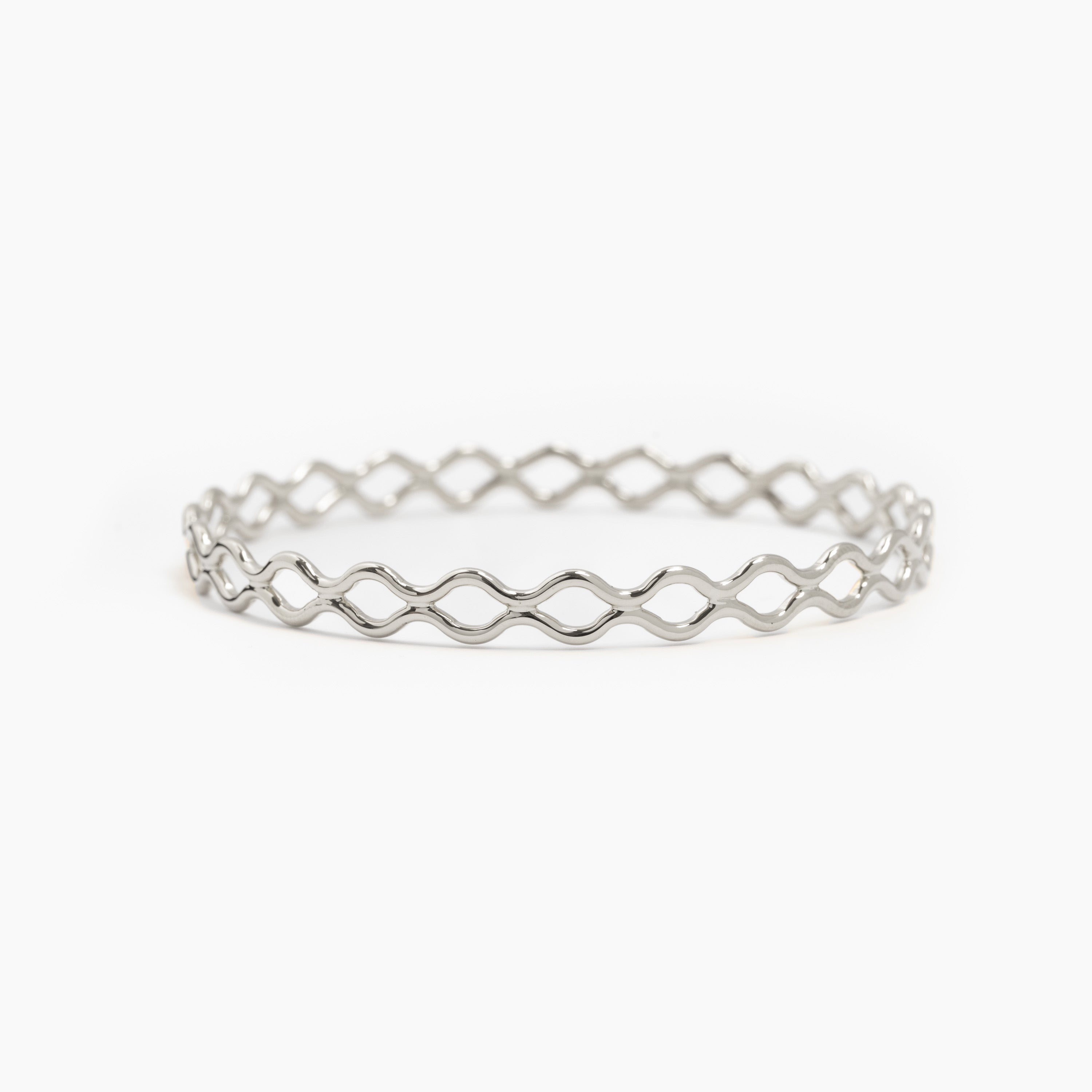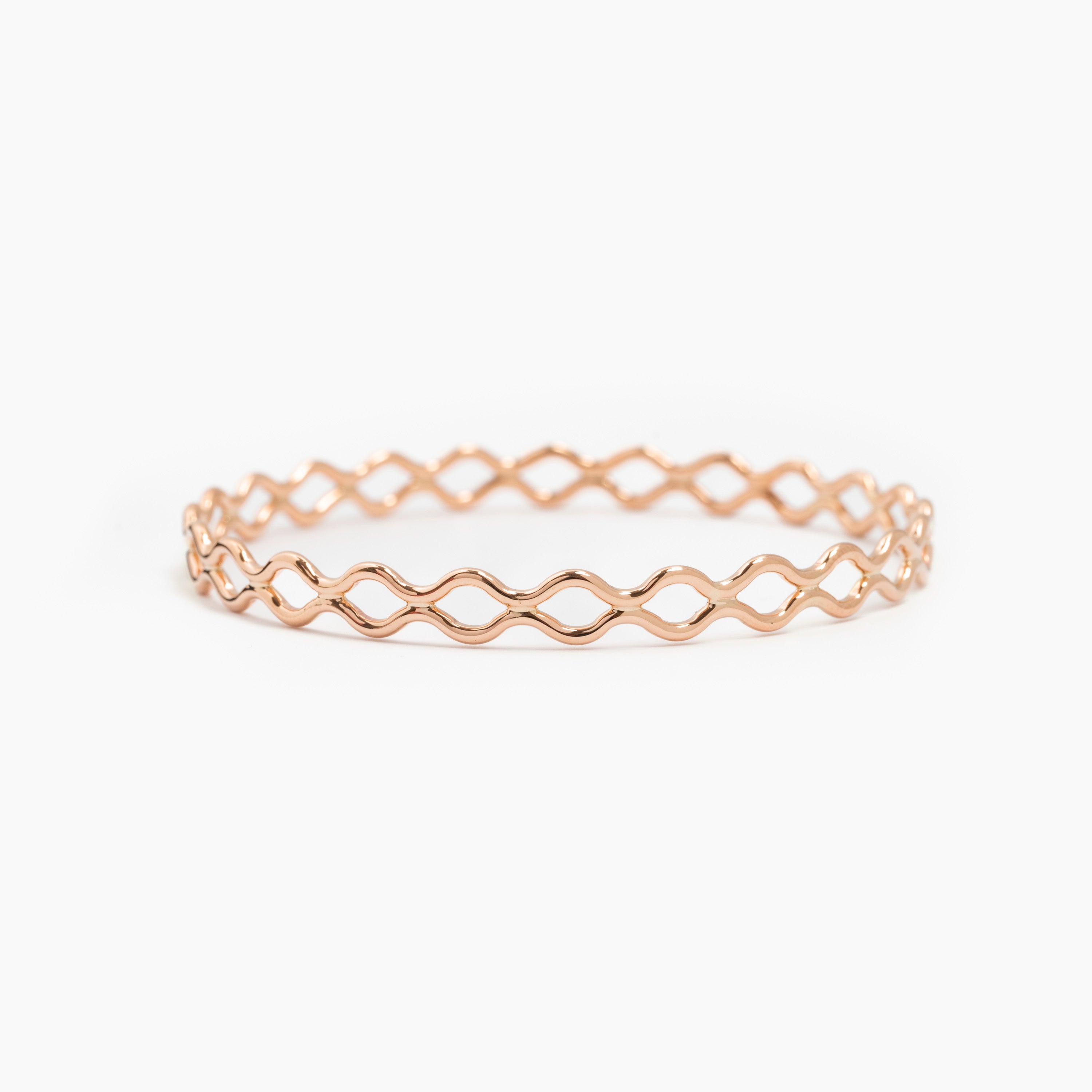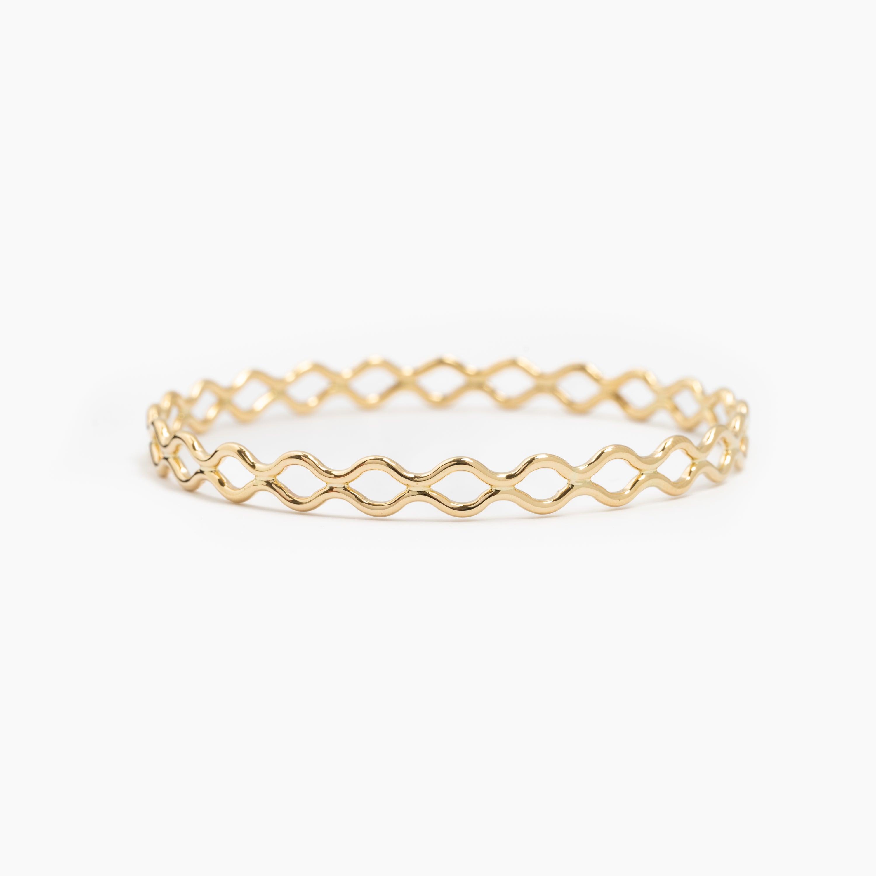 Two of our Heavy Weight Bangles pressed into a wave pattern and connected together for an unbreakable bond and a light, airy design.