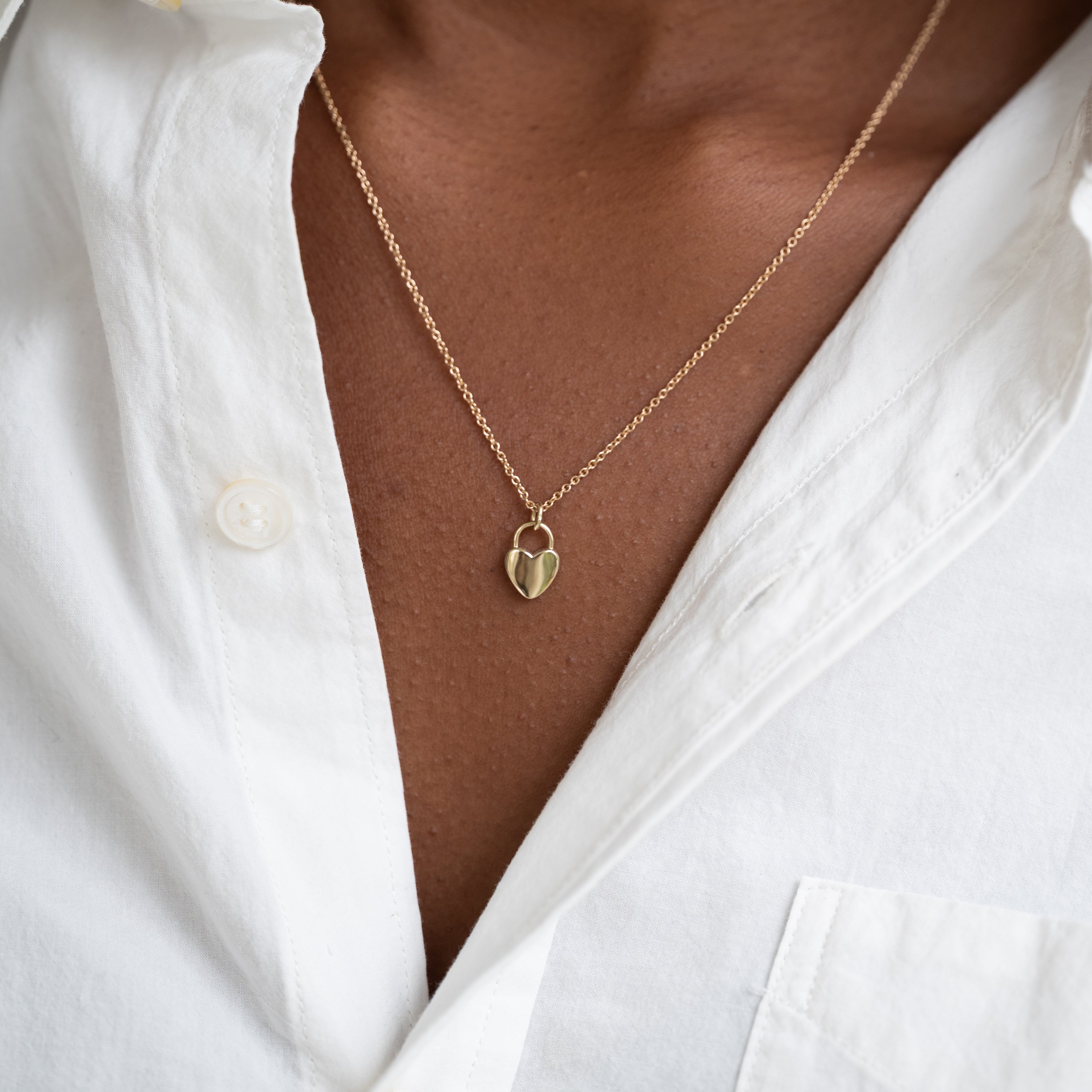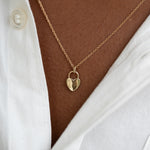 A 12 x 8 mm heart padlock pendant with your choice of a machine engraved initial or monogram.