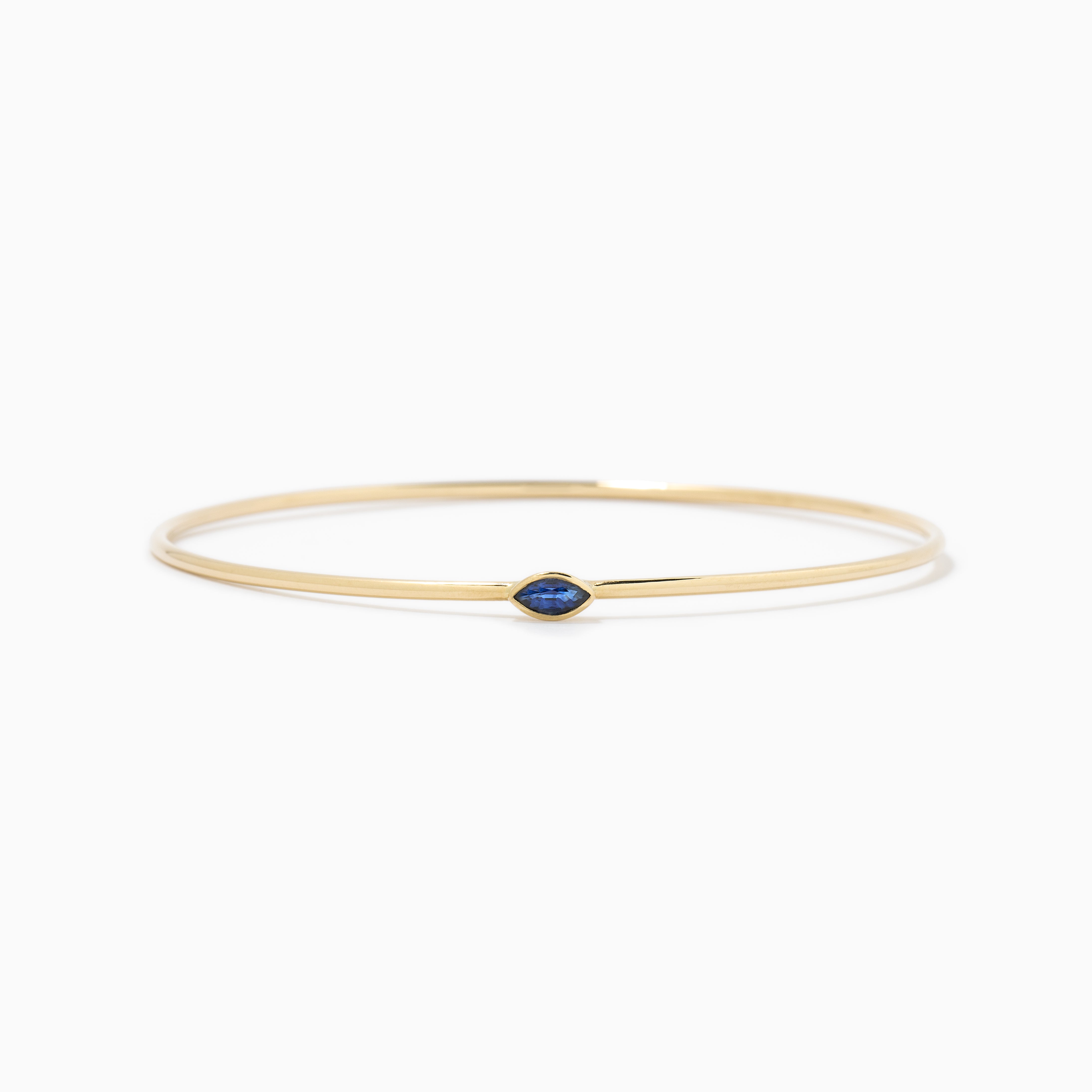 The Heavy Weight bangle customized with one bezel-set marquise-shaped birthstone. A 1.6mm round solid 14k gold bangle. Stones are 6mm set in a 14k gold bezel setting at approximately .25tcw per stone.