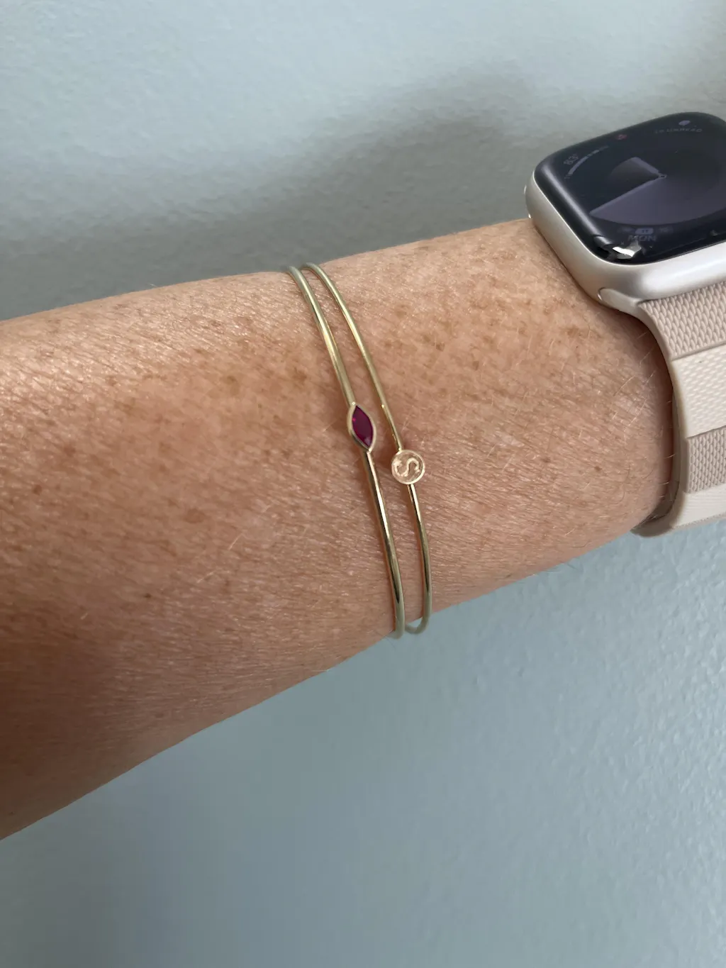 The Heavy Weight bangle customized with one bezel-set marquise-shaped birthstone. A 1.6mm round solid 14k gold bangle. Stones are 6mm set in a 14k gold bezel setting at approximately .25tcw per stone.