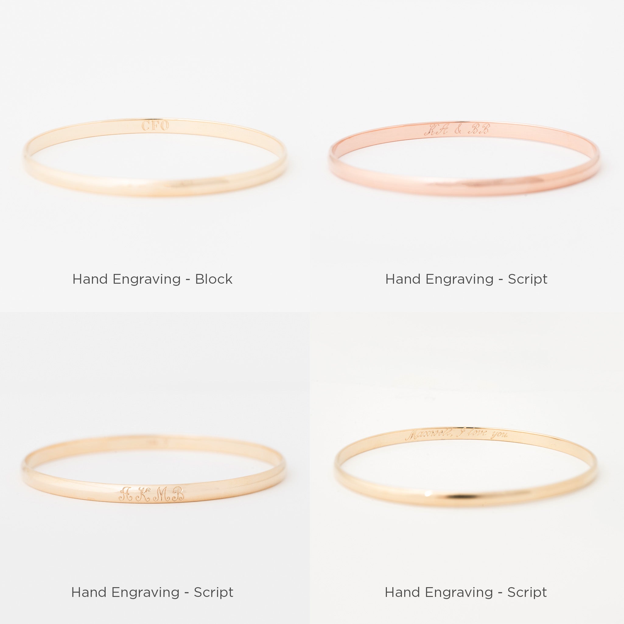 A beautiful statement bangle that stands out in a stack or statement worn alone. Add hammering for texture or engraving (inside or outside) for a personalized touch.