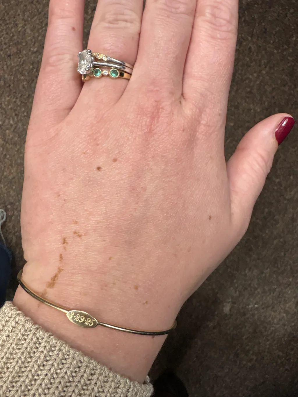 Adding the monogram bangle to my stack was the PERFECT addition. Not only is it beautifully personalized I think it ads just the right amount of texture. The yearly team was also amazing in accommodating the date I needed to receive the order by. I can never say enough good things about this brand and the quality of products they produce. 10000000/10!!!