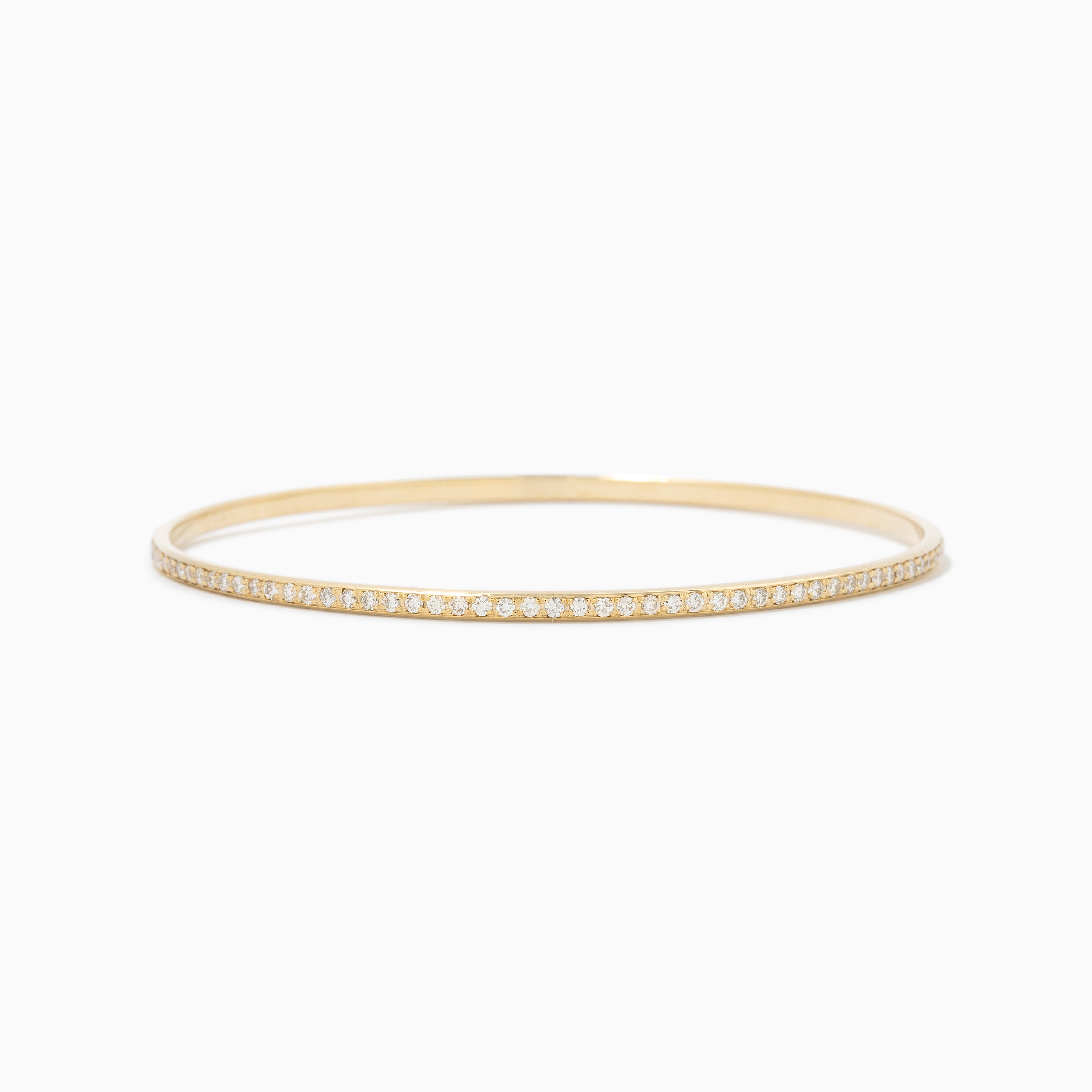 A full diamond bangle to celebrate the biggest milestones. Made to be worn every day, the Thin Pavé Bangle has a full band of diamonds with a thin edging of gold. The Thick Pavé Bangle features a wider gold edges for a more substantial stack.