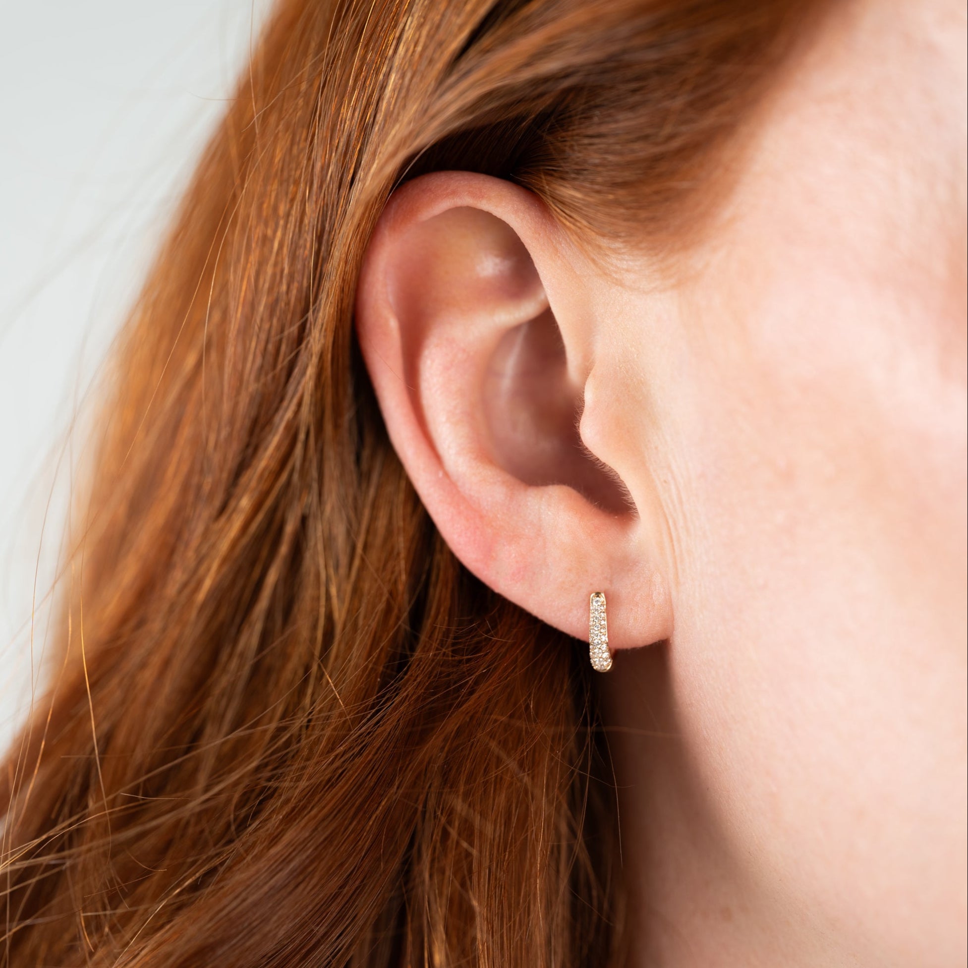 A petite take on our classic Pavé Diamond Hoops. Crafted in solid 14k gold and set with natural diamonds, these huggies offer subtle sparkle in a smaller silhouette. With a secure click-closure and lightweight feel, they’re made for effortless, everyday wear.