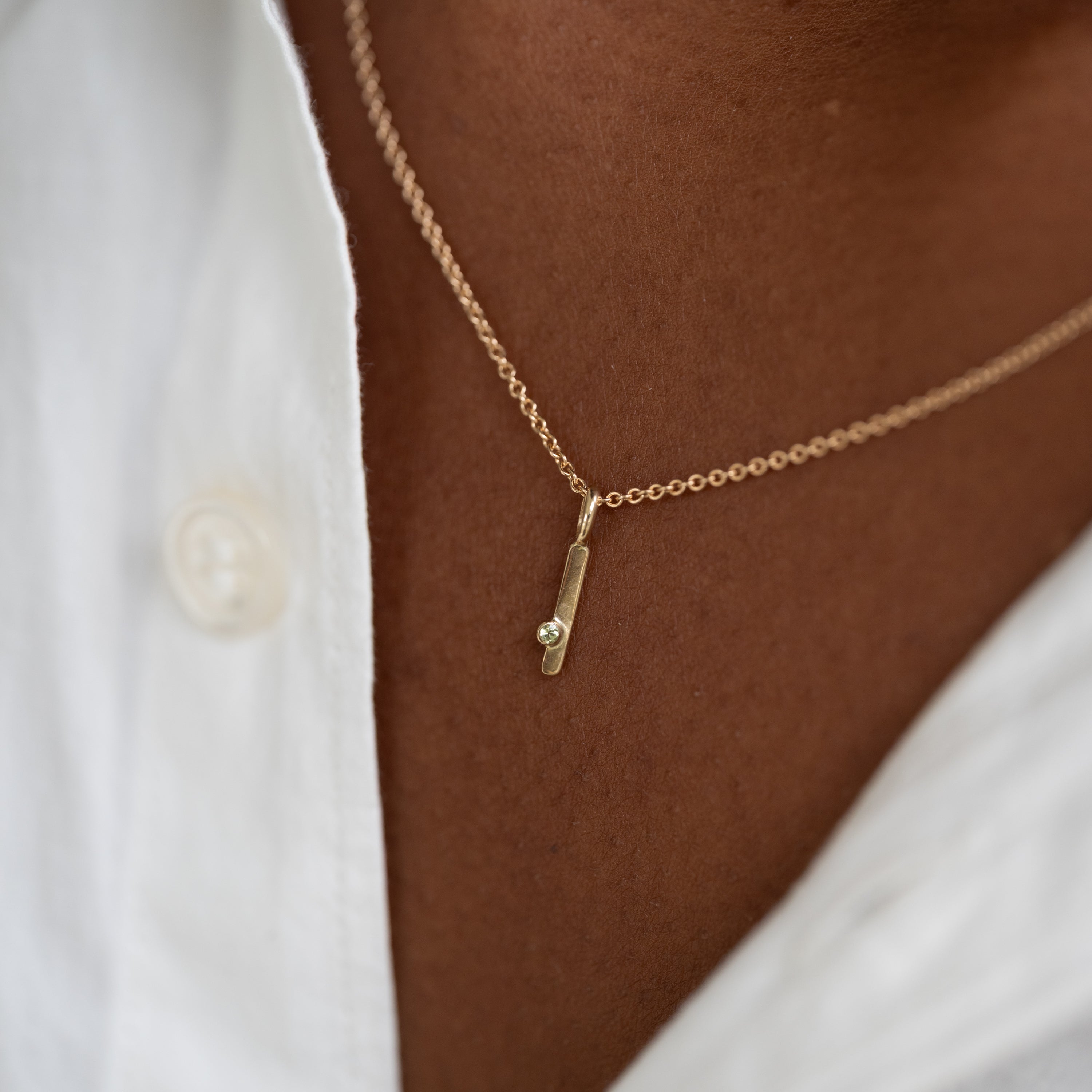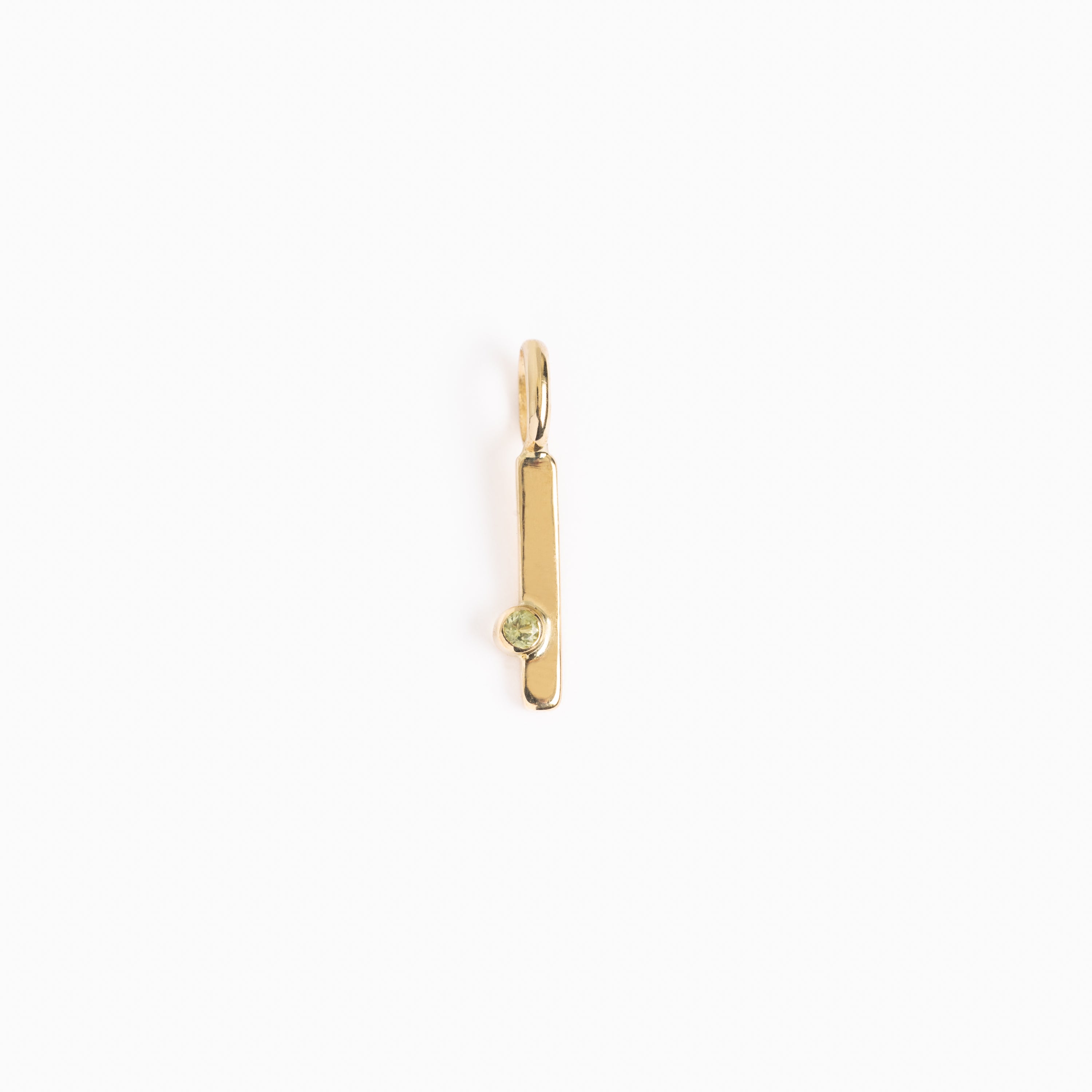A 15 mm vertical bar pendant featuring a 0.015 ct peridot.