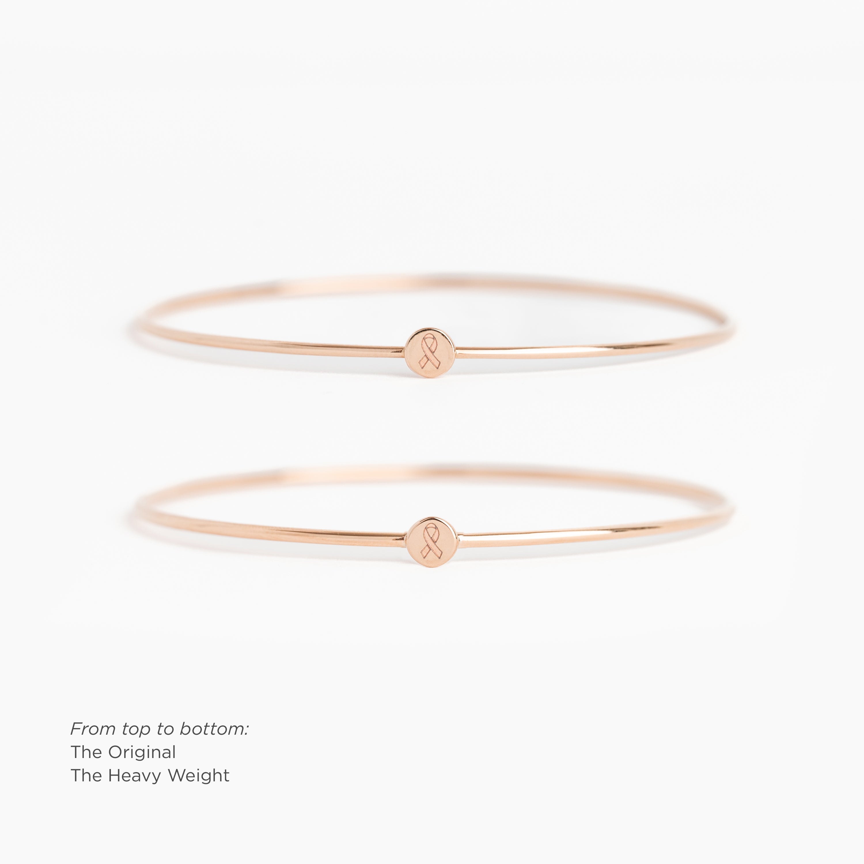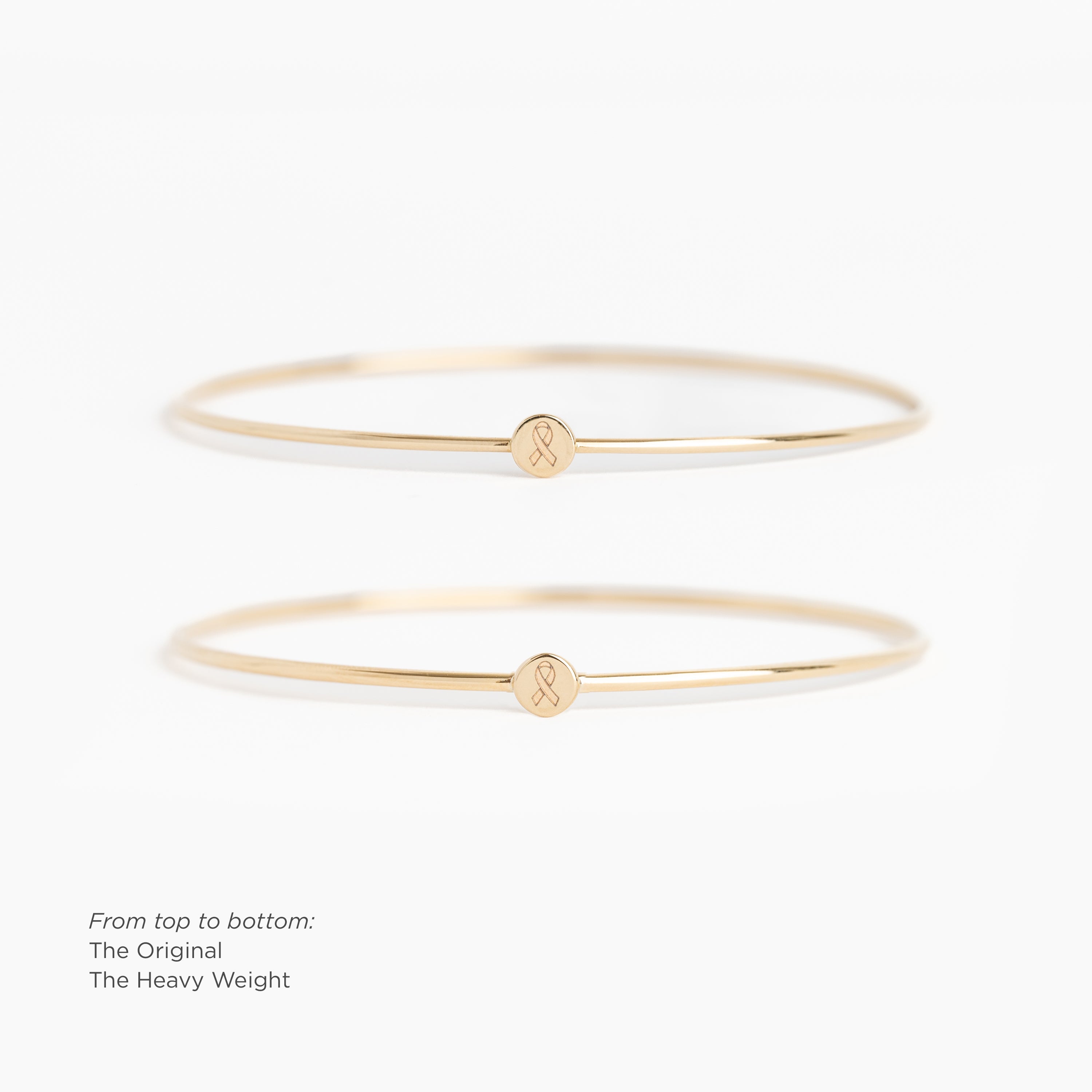 The Ribbon Bangle is a meaningful take on our classic design, featuring an engraved cancer awareness ribbon at its center. Crafted from solid 14k gold, this bangle represents strength, resilience, and support for those affected by cancer. The simplicity of the bangle makes it a timeless piece that can be worn daily or layered with other favorites.