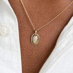 A 9 x 12 mm mini oval pendant featuring a bezel set 1/4 ct marquise diamond.