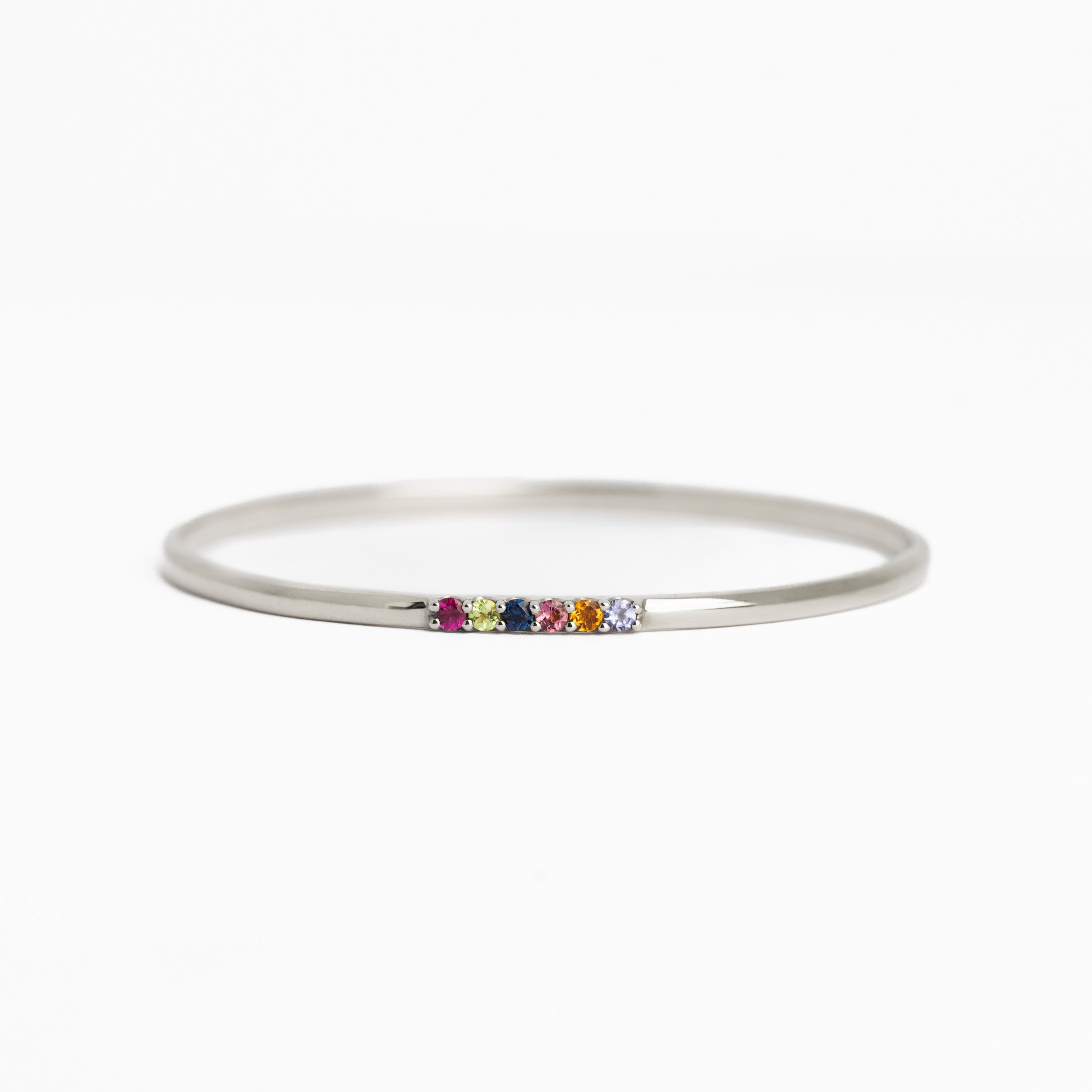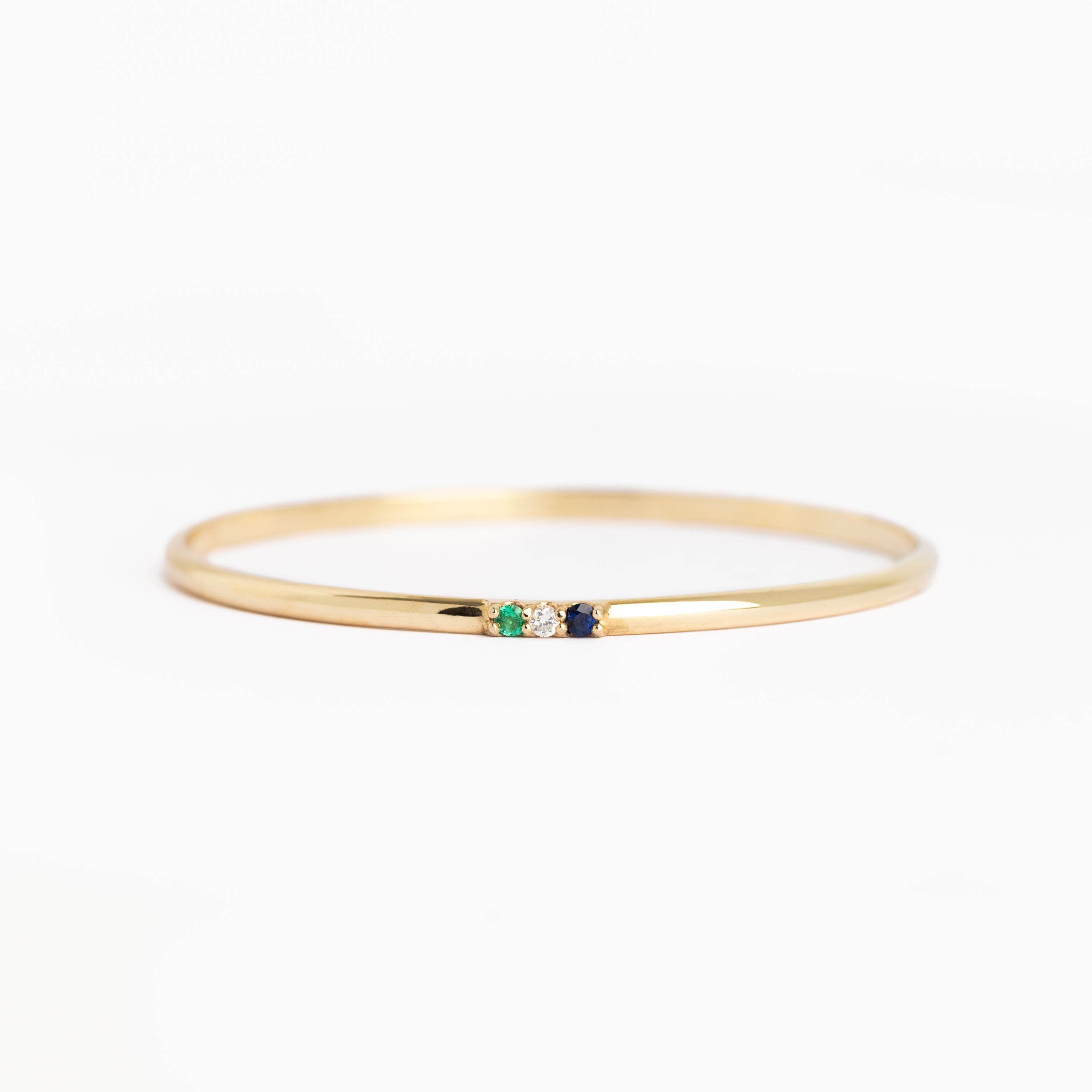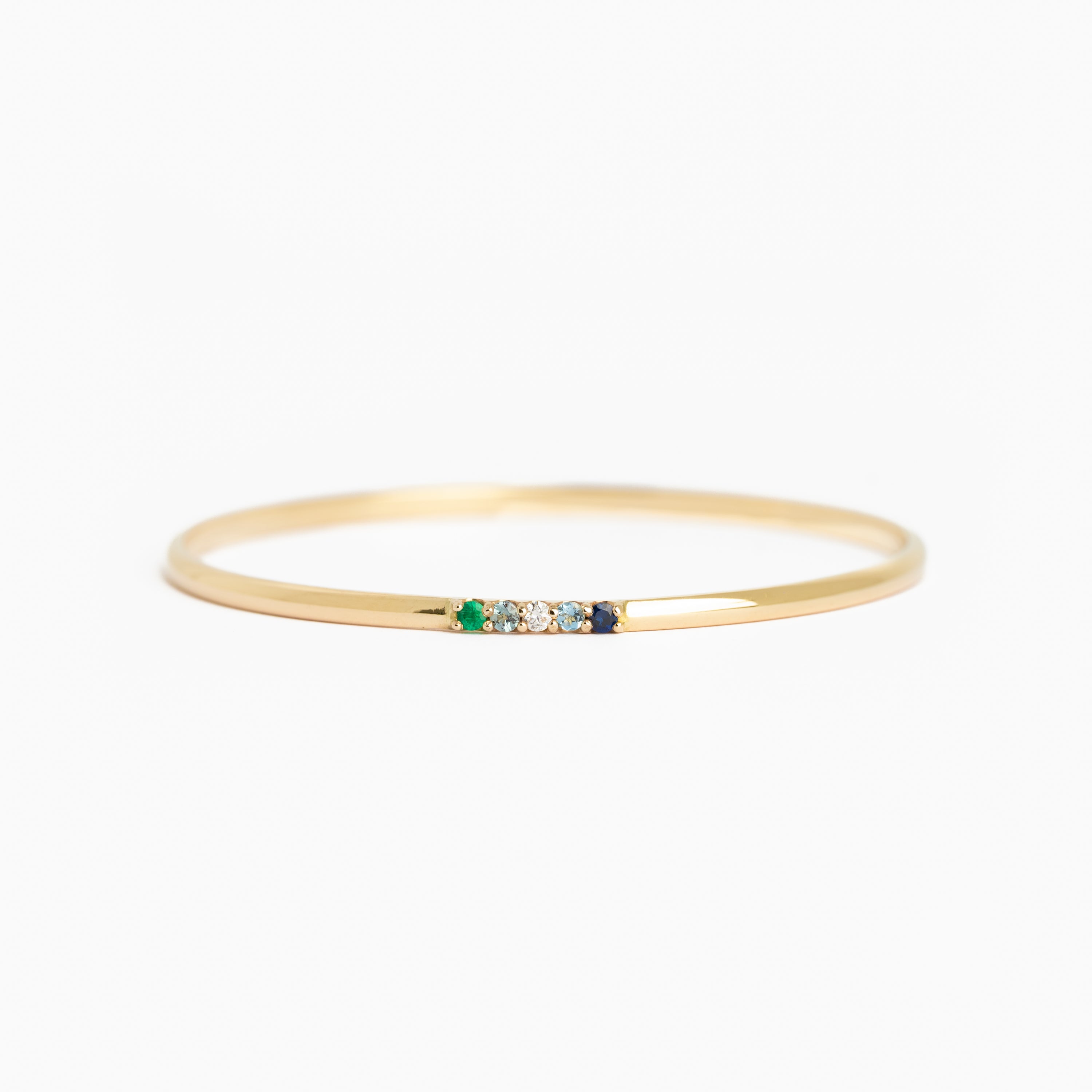 The Stacked Birthstone is a unique style customized to your story. Choose 3-6 natural gemstones in a secure and stunning prong setting on a solid 14k gold bangle. A 3x2mm solid 14k half-round bangle with 3-6 shared prong set natural gemstones.