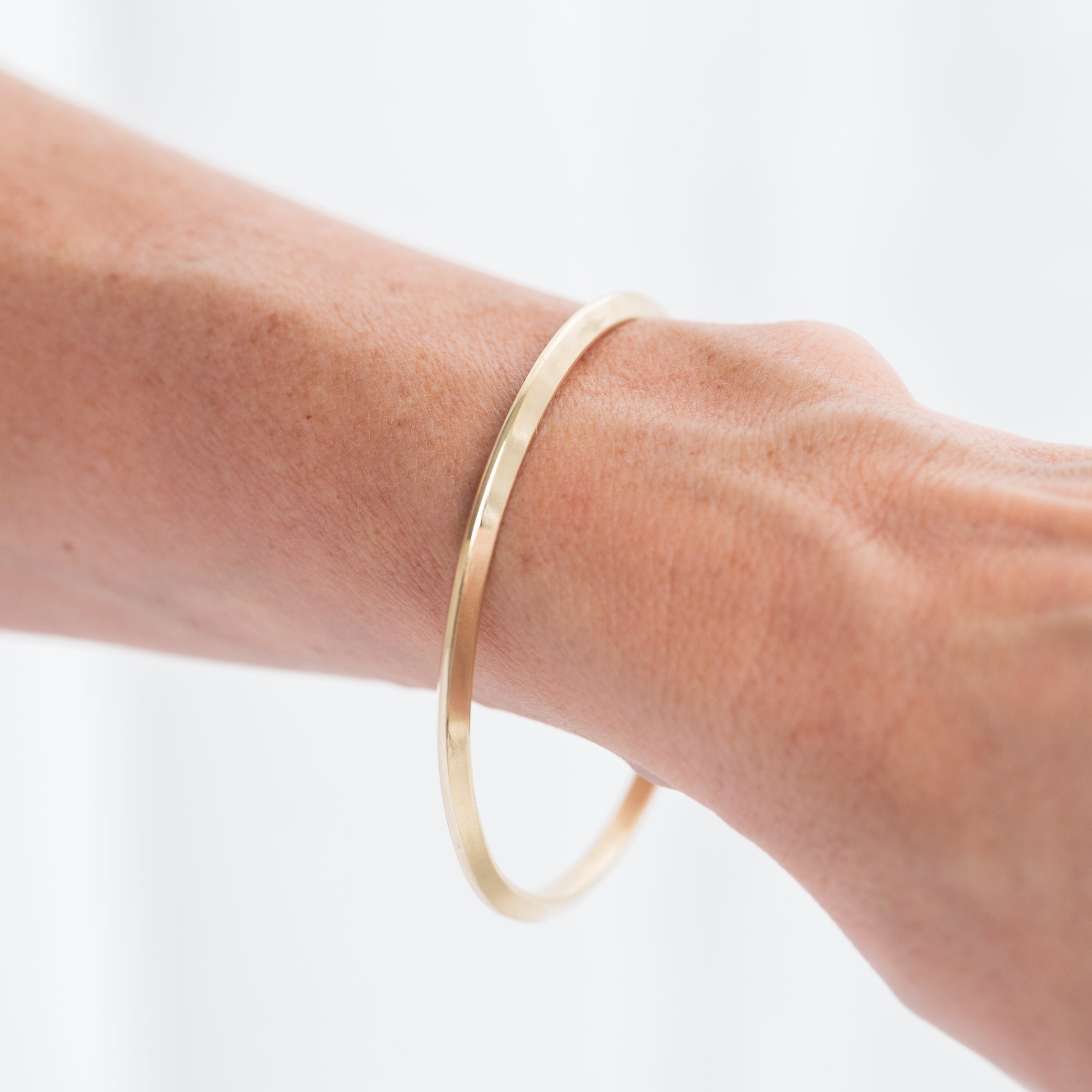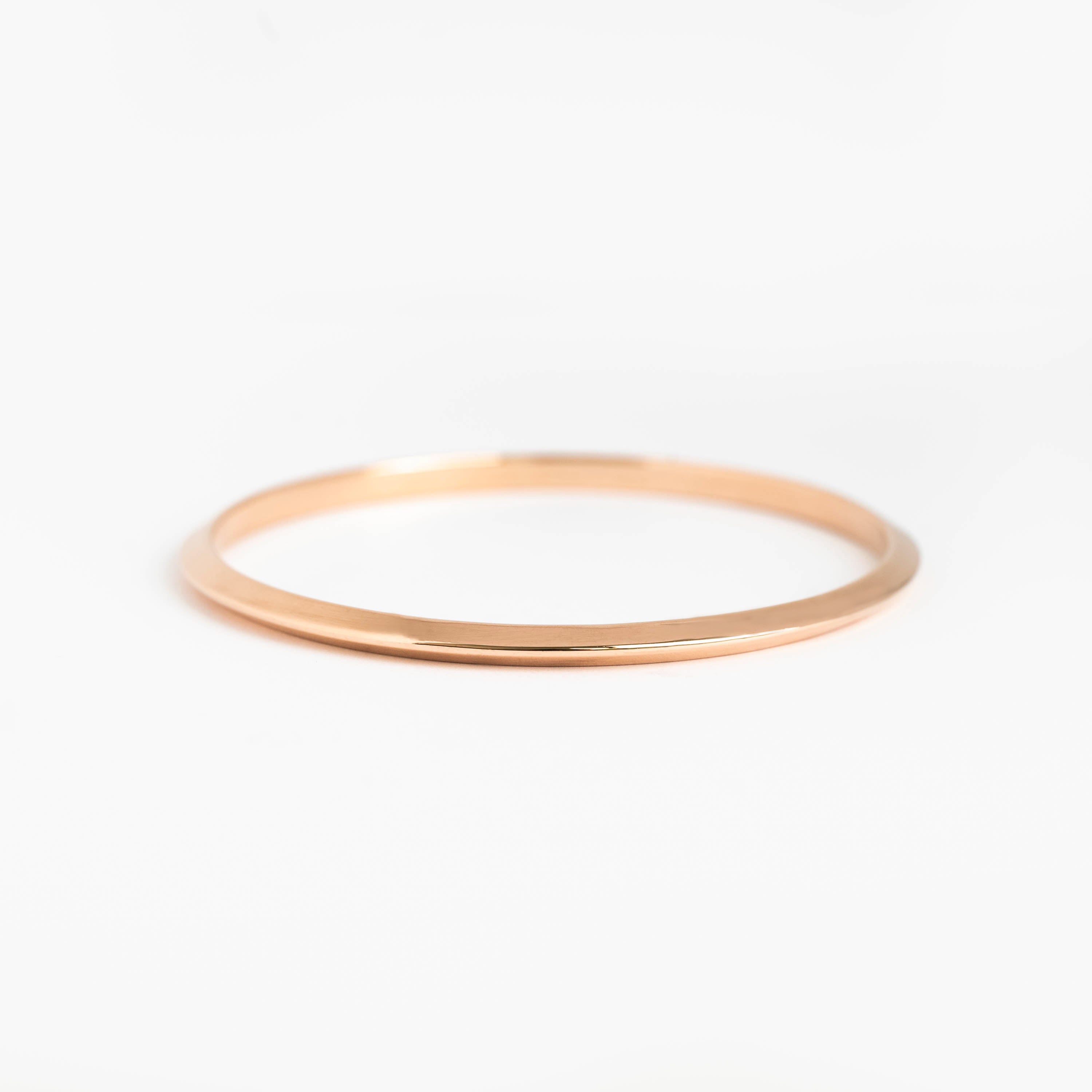 This triangular-shaped wire makes a beautiful "knife-edge" bangle. This subtle pointed shape adds dimension and shine. A 4mm x 3.5mm solid 14k gold bangle.