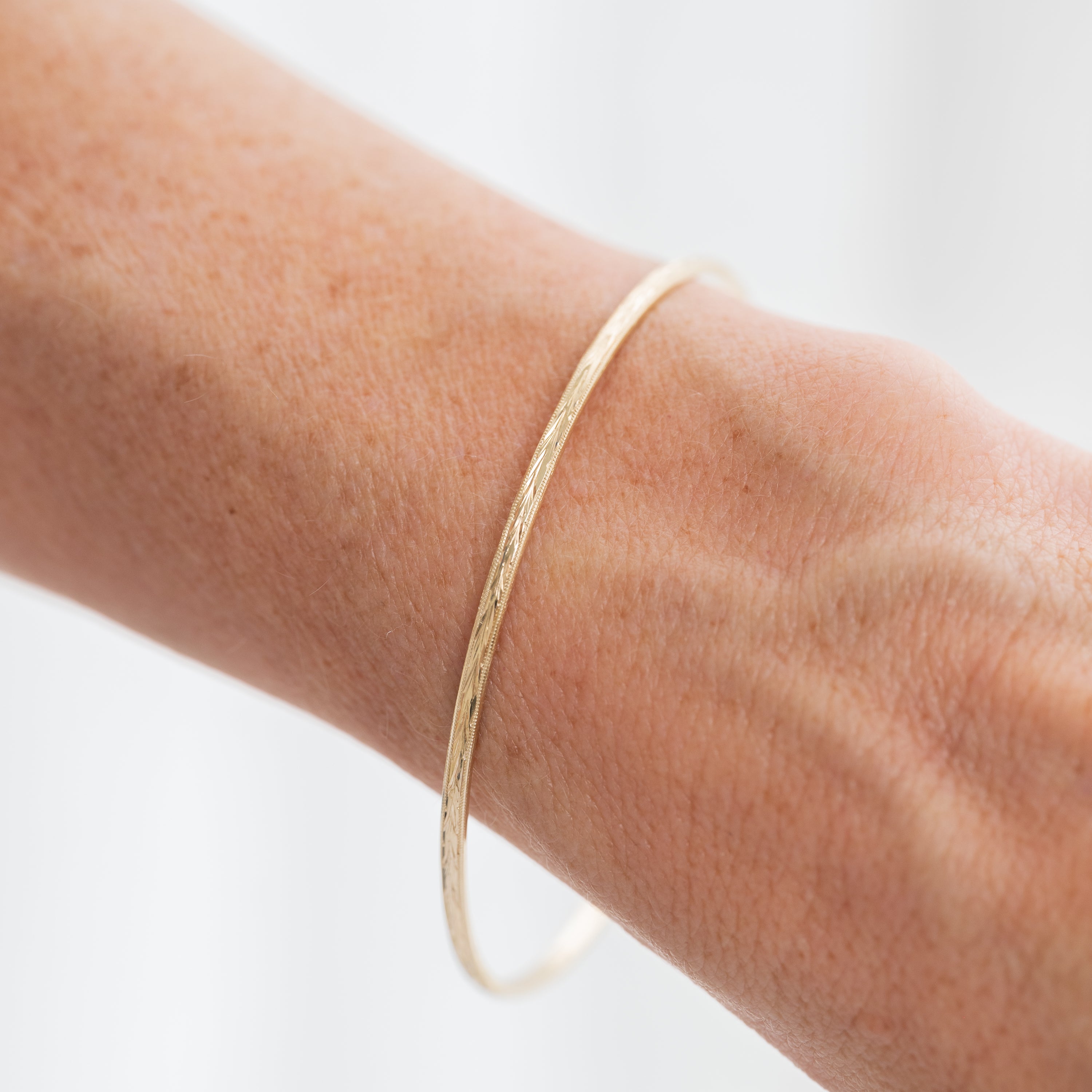 I got this bangle to commemorate another year at my first “big girl job” out of college. The hand engraving is to die for, and the details on this bangle is amazing. While it looks petite, it’s sturdy and has less flexibility than the original or heavy weight bangles. The Yearly Co customer service was amazing, and they responded quickly to any questions I had. I’m very happy with my purchase, and can’t wait to potentially get another engraved piece!!