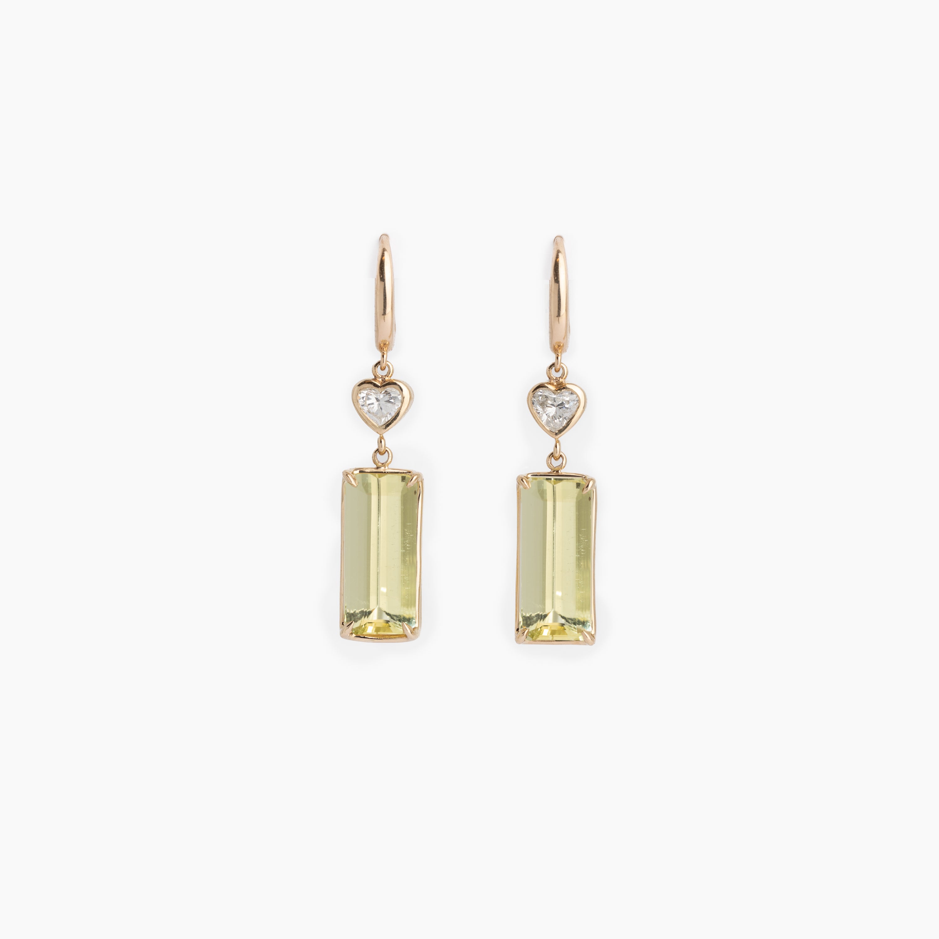 These stunning lever back hoops are a true statement piece, featuring captivating basket set yellow beryl baguettes that radiate a warm, golden glow. Adding a touch of romantic sparkle, each hoop is beautifully accented with bezel set heart shaped diamonds. The unique combination of vibrant gemstones and playful diamond accents creates a luxurious and eye-catching design.
